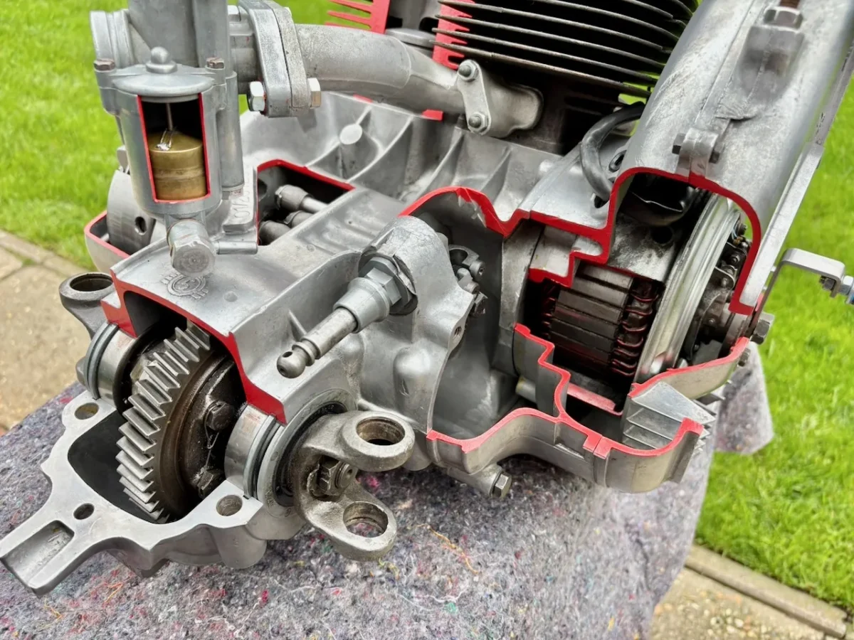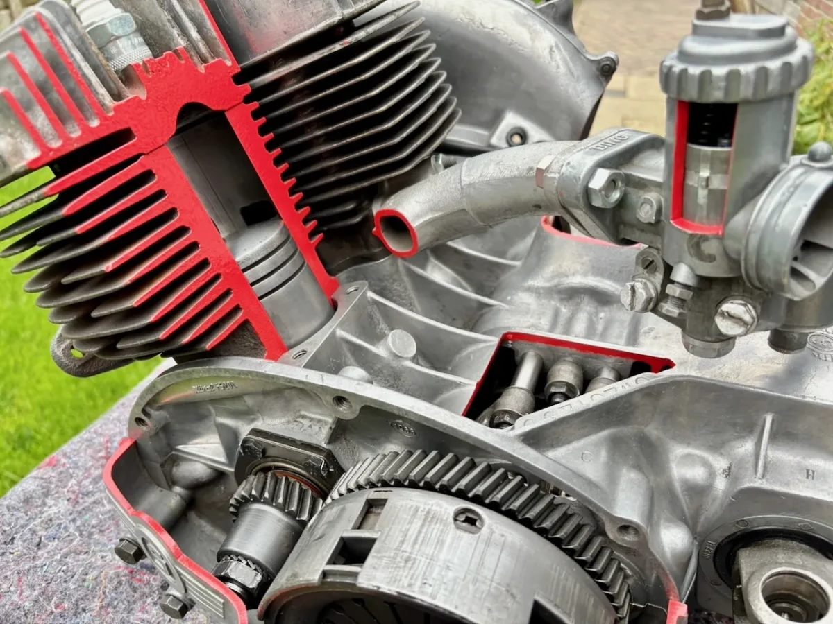 Het begint ergens op te lijken! De volgende stap was bepalen waar ik stukken uit de motor kon slijpen, zodat je 'interessante' dingen kunt zien, maar het wel nog in elkaar blijft zitten. Na veel passen, meten, proberen en bedenken kon ik met de flex aan de slag. Bij deze modellen zijn de randen van de weggehaalde delen vaak rood of oranje geverfd, en dat leek mij ook mooi. Dus ging ik aan de slag met het kleinste potje rode metaalverf dat bij de bouwmarkt te krijgen was.
