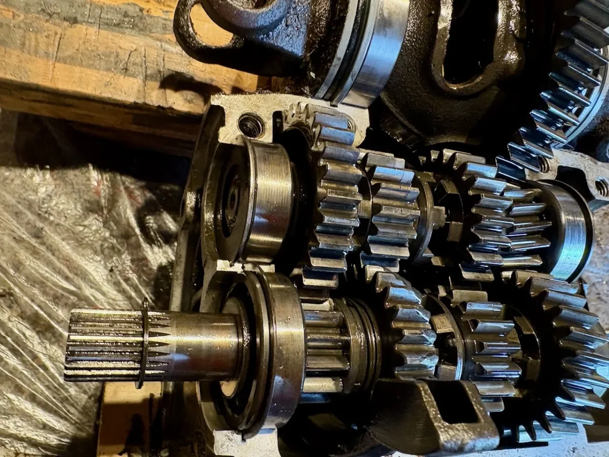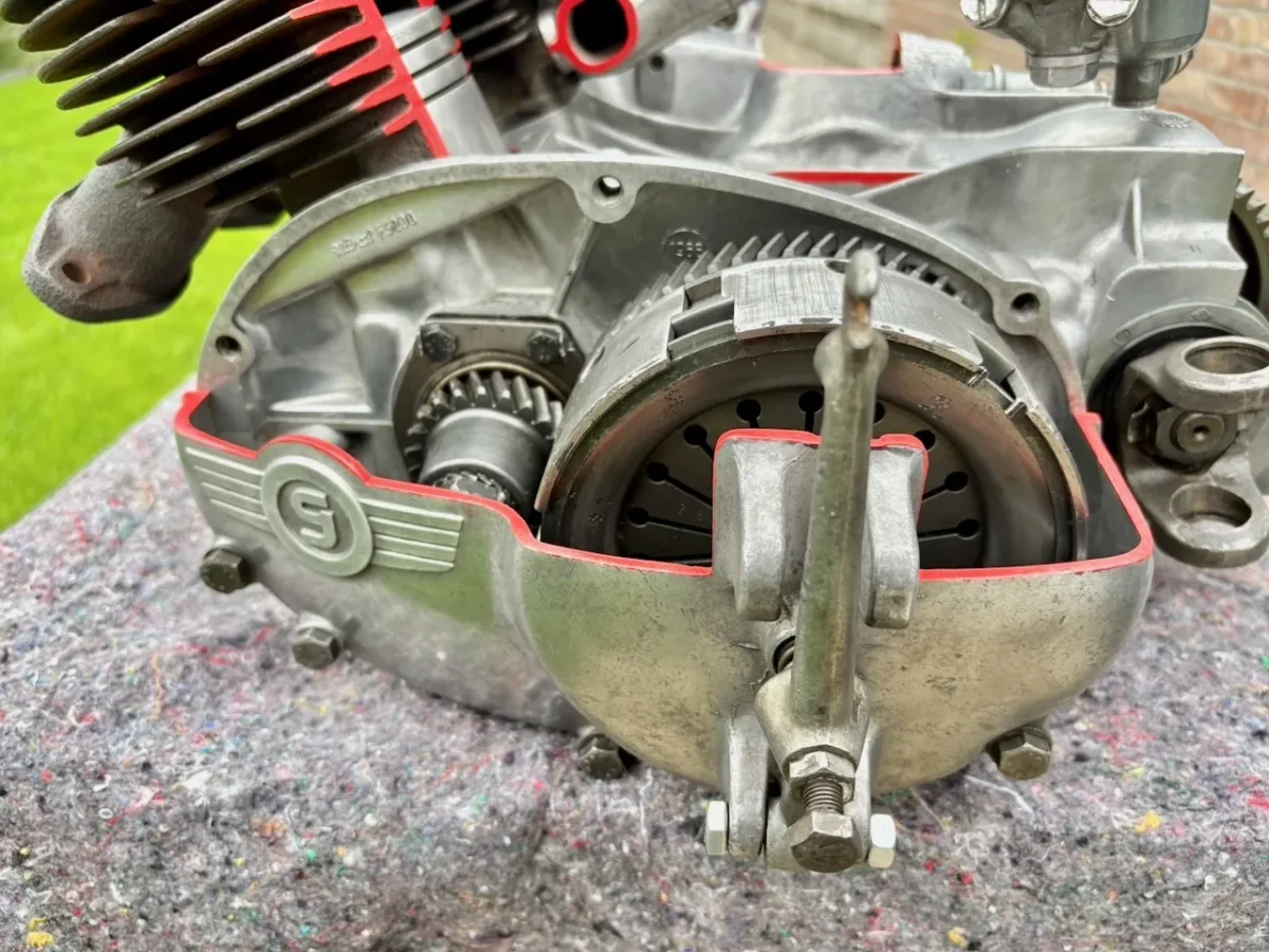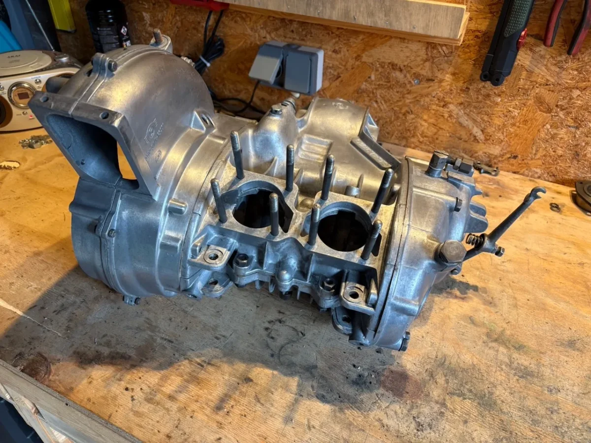Vervolgens kon ik de buitenste delen verwijderen; de cilinders, zuigers, koppeling, dynastart, waarbij alleen de koppeling enigszins een gevecht werd zonder het juiste gereedschap. Met een stuk van een kruisheng en een paar bouten lukte het gelukkig om de koppeling in te drukken en de ring die 'm op z'n plaats houdt te verwijderen. Toen kwam het grote moment; de eerste keer dat ik een Goggo-versnellingsbak in het echt voor m'n neus zou zien.