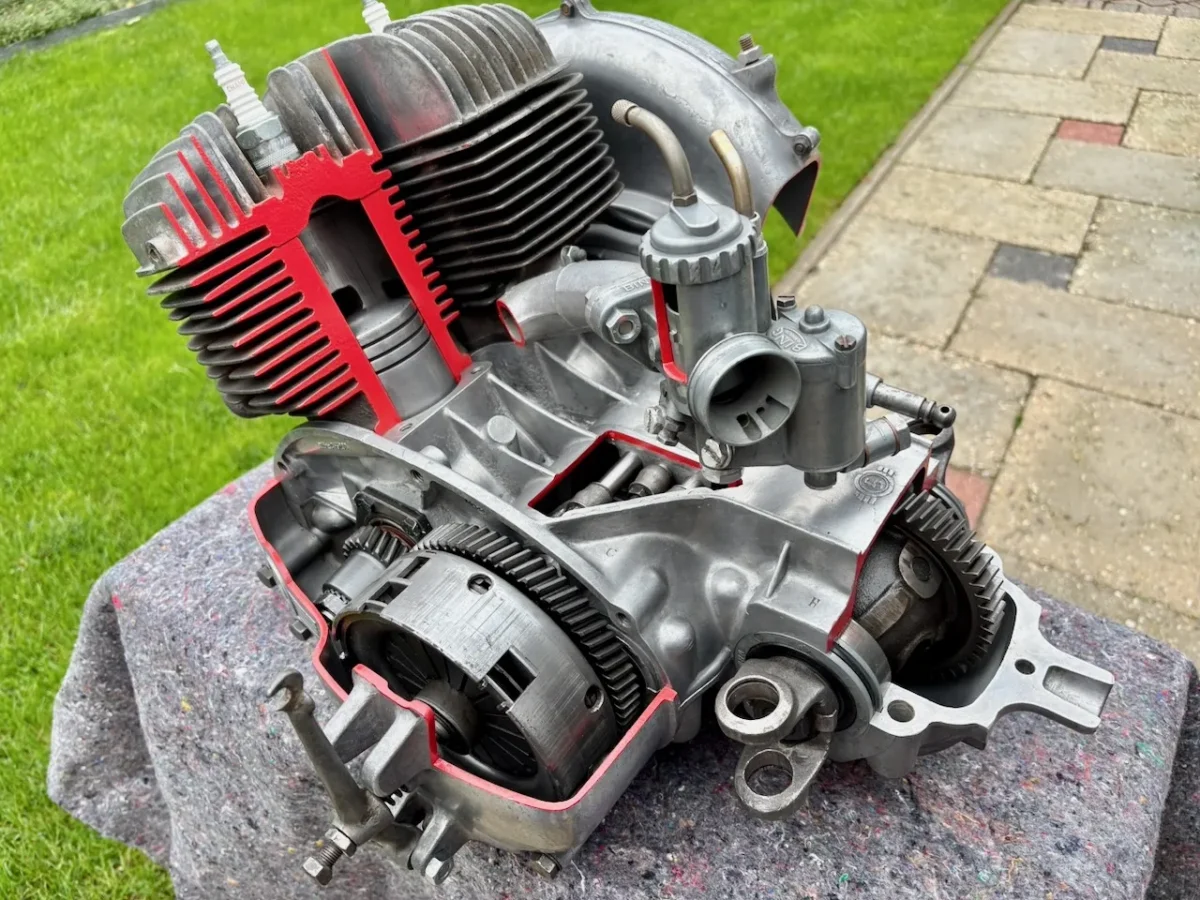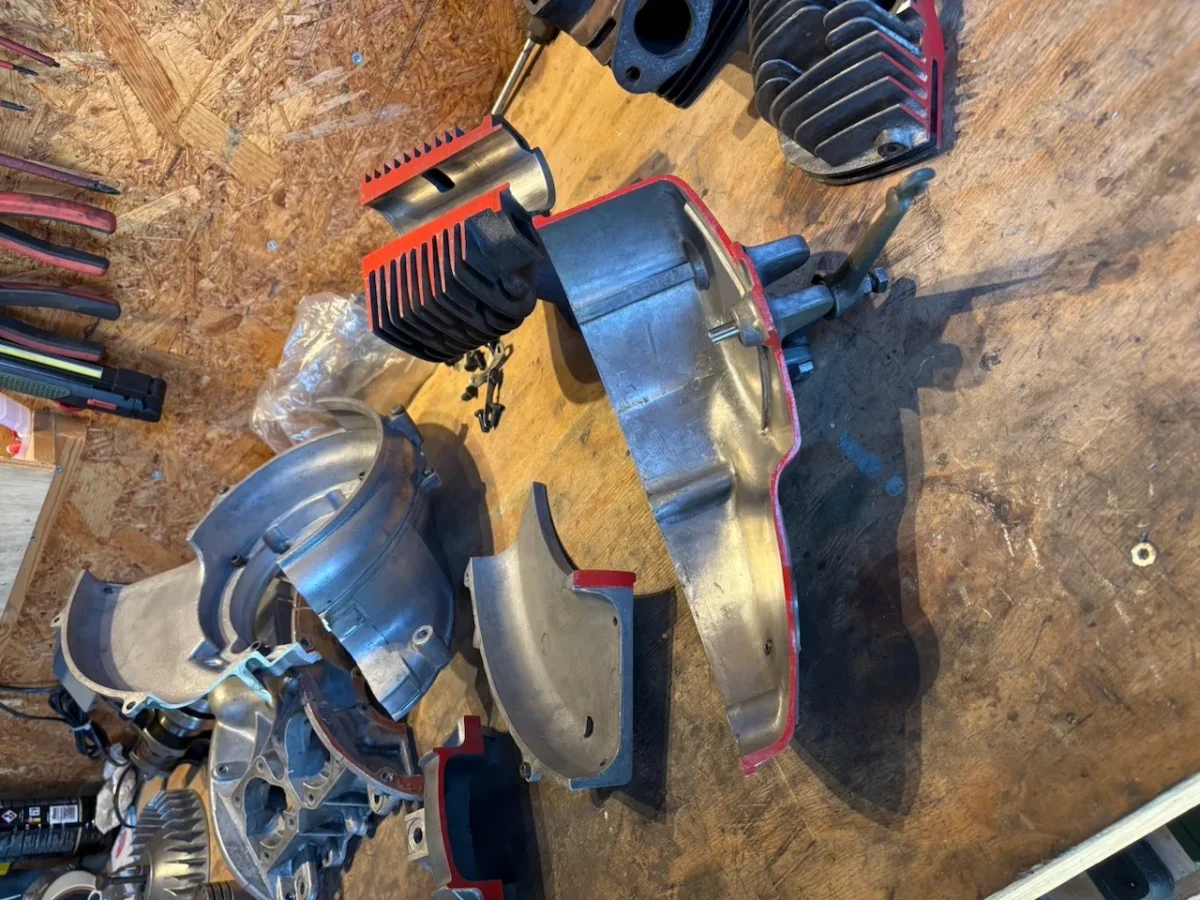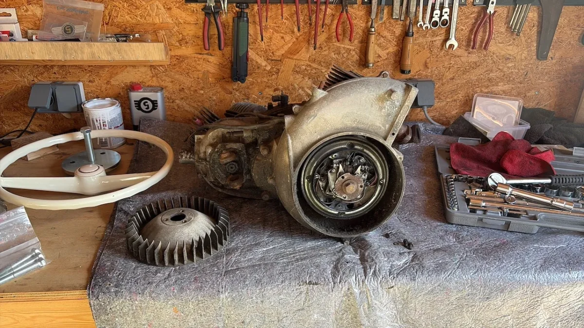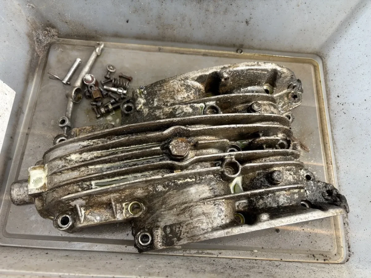 Met een vuile, vieze en vastzittende motor kon ik aan de slag. De eerste stap was de boel gangbaar krijgen, want een van de twee cilinders zat muurvast. Met heel veel kruipolie en langzaam een beetje heen en weer bewegen kwam de boel los.